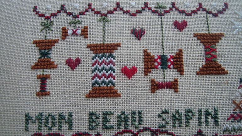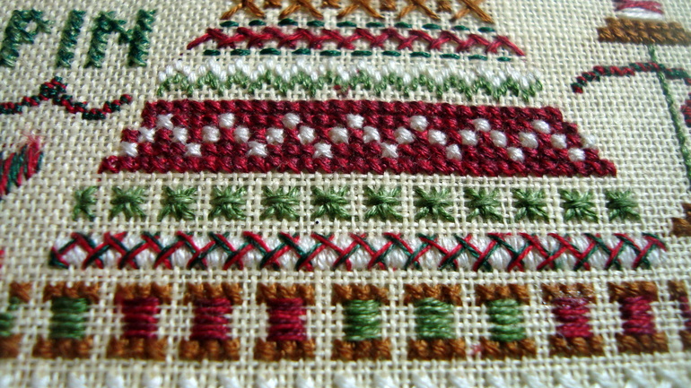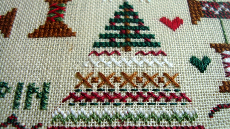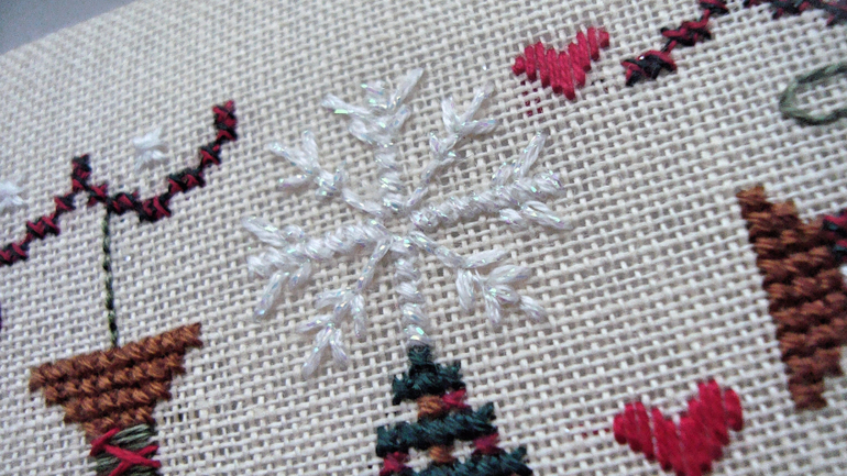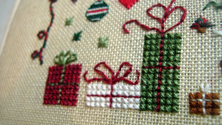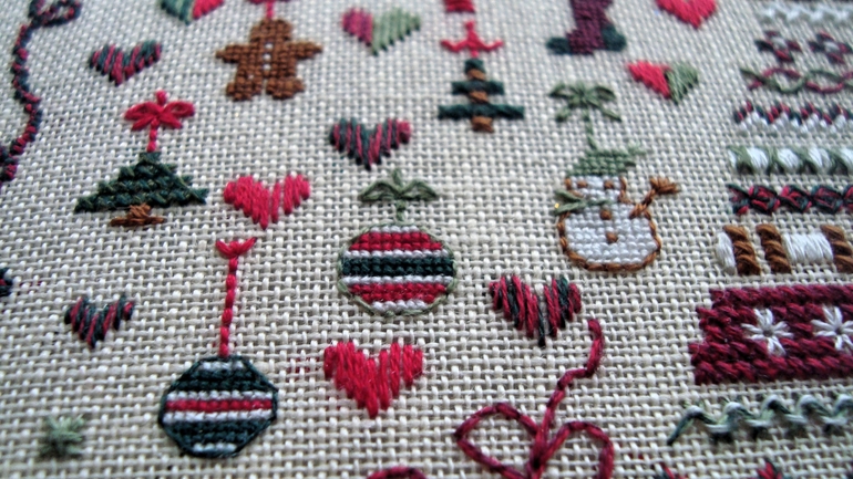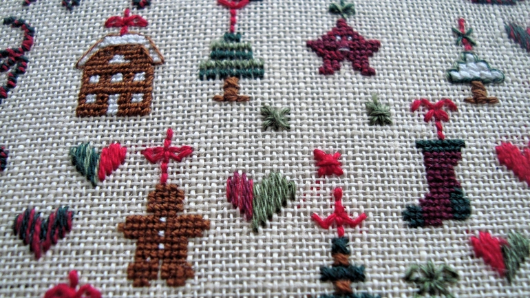 Работа шла легко - много мелких деталек, вышивать их одно удовольствие. За одним исключением - елочные игрушки вышиваются крестиком через одну нить. А вот там где использовались различные шовчики, моя душа отдыхала))) Это особенная изюминка данной работы)))