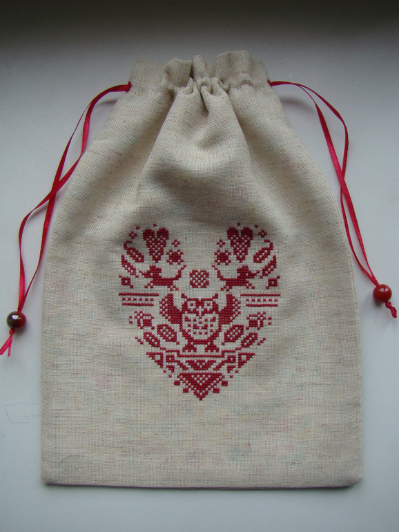 А еще для обмена у меня вышились вот такие замечательные вещички, первый, не очень удачный мешочек сейчас хранит конструктор моей дочурки.