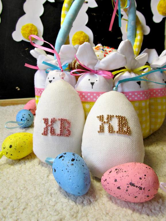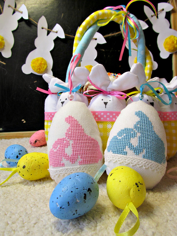 Далее на Пасху сотворилась у меня корзинка с зайцами, и вышилось два яичка моим зайчатам))