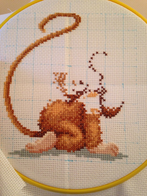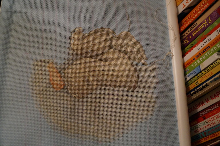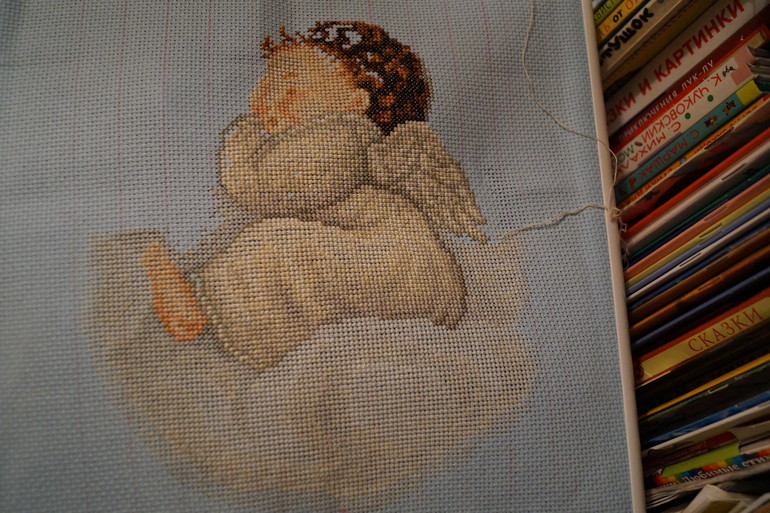 Наш не сидит спокойно, постоянно прыгает, залезает повыше, мелкого дразнит...в общем иногда дом стоит на ушах, надо постоянно его одергивать и следить. Поэтому вышиваю ночью и когда они вместе спят.