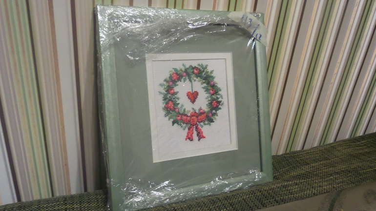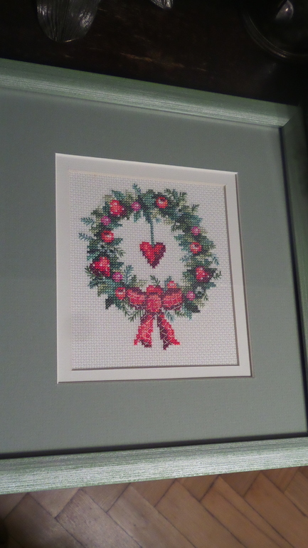 Вышивался этот набор в подарок маме на НГ, но багетка была загружена и в итоге работу я забрала только вчера. Ещё случилась оказия-перед оформлением решила прогладить ещё канву и мой утюг плюнул на неё накипью(((( Но мастер все удачно прикрыл. Я довольна
