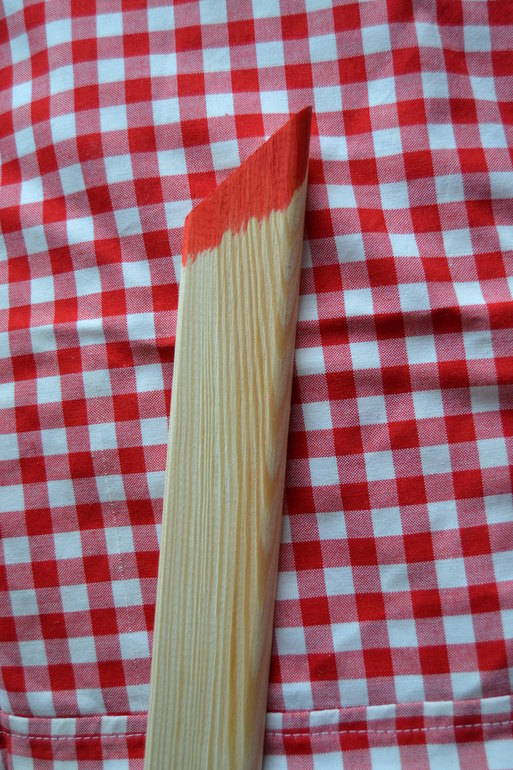 На оставшимся куске рейки пробуем краску.У меня была красная акриловая,но я побоялась,что мне не хватит.Взяла развела красную гуашь и чтобы она не потекла добавила акриловый лак.Пробуем.