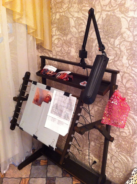 Станки,пяльцы,органайзеры и другие принадлежности для вышивкиНа День Рождения муж сделал мне сюрприз и подарил напольный станок! Именно то что я хотела, со всеми дополнительными аксессуарами:лампа, боковая натяжка, полочка под всякие мелочи.У меня был обычный диванный станок,но он был не устойчивый и без дополнительных аксессуаров.Ну вот собственно и он мой красавец!