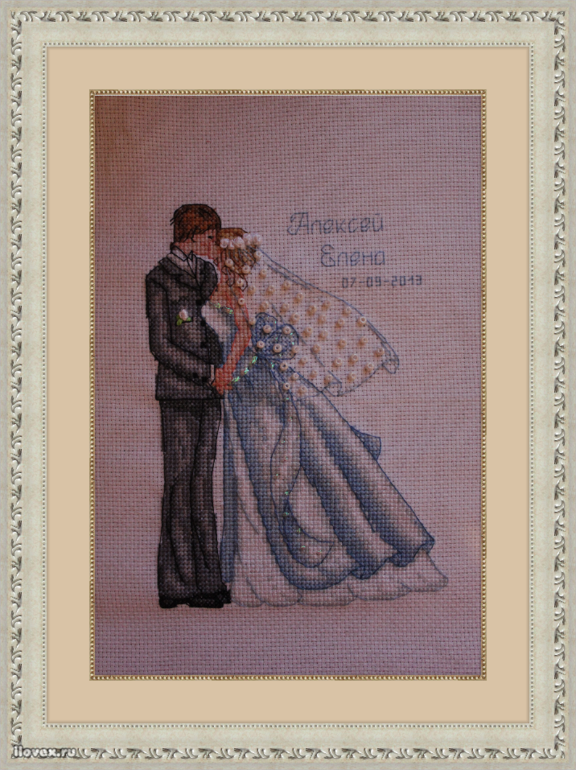Вчера я закончила вышивать свою первую свадебную метрику в подарок нашим друзьям не к дате, а просто так. Набор выбирался по принципу "что побыстрее", поэтому выбор пал на "Свадебный поцелуй" от Panna. Не стала я пришивать к поясу бисер, слишком много его и на фате. Зеленые листочки на голове невесты тоже не стала делать.