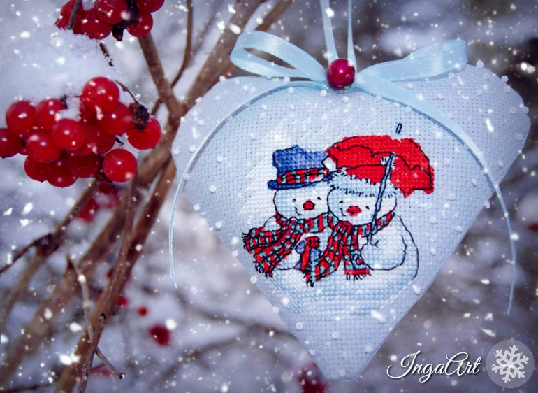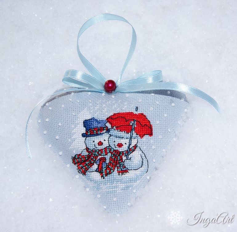 Ещё вам хочу показать первую вышитую крестиком игрушку - украшение на ёлочку. Автор схемы снеговичков тоже Е. Немшилова. Люблю её схемы - яркие и позитивные))) Очень тема понравилась, думаю будет продолжение))