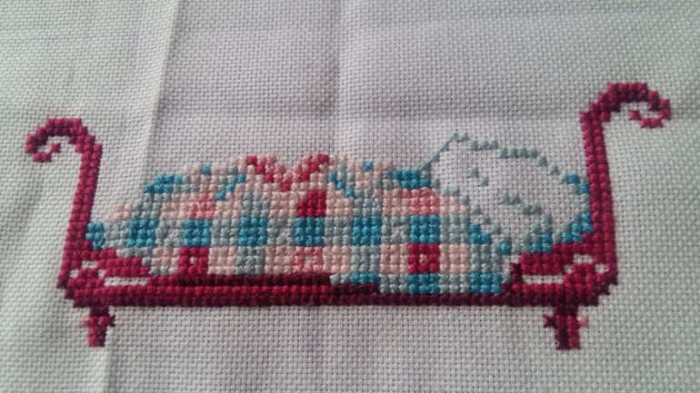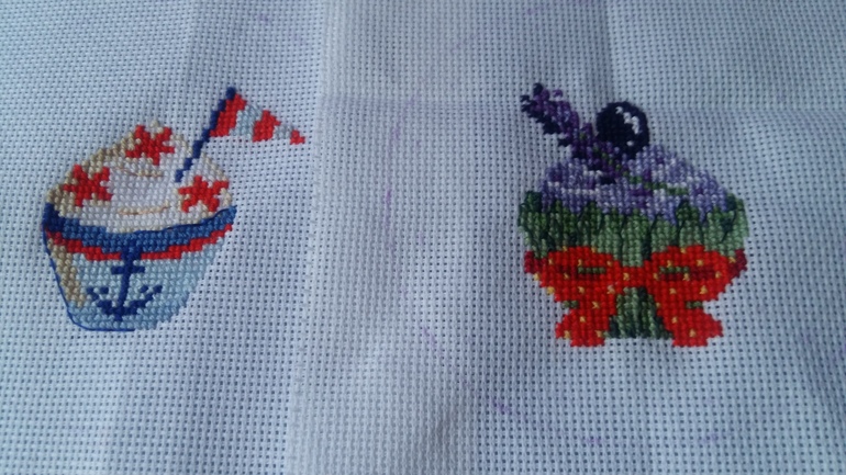 Я закончила свои кексы, остался только фон за ними (клеточка) но не знаю, нужен ли он, т.к. еще не придумала оформление. Пока гуляля по просторам www в поисках идеи оформления, нашла кое-что, что срочно захотелось вышить, тем более соответствует рамкам совместника. Покажу что есть, а сама прелесть сюжета будет видна к следующему отчету.
