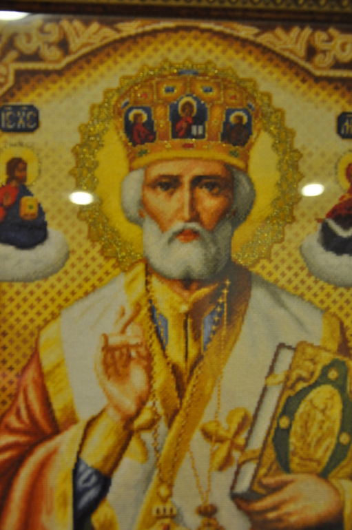 "Николай Чудотворец" была первая вышитая икона этого дизайнера. Сейчас она стоит у нас в спальне, очень ее люблю. Стекло бликует и фото конечно не лучшего качества((.