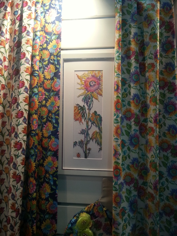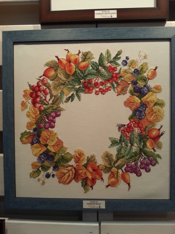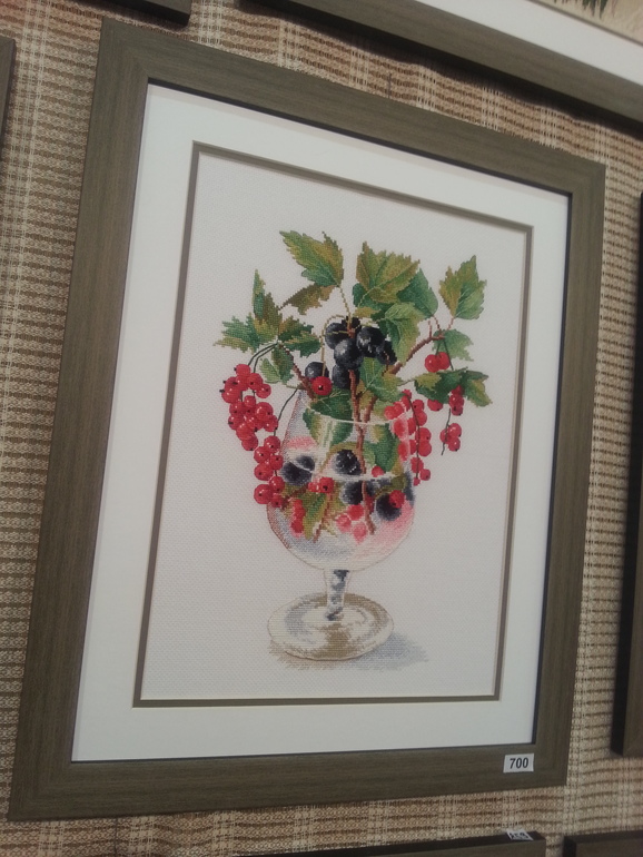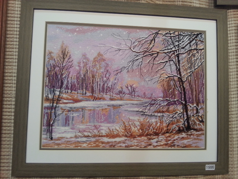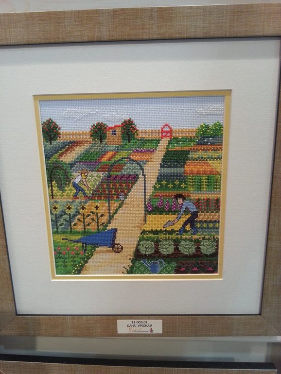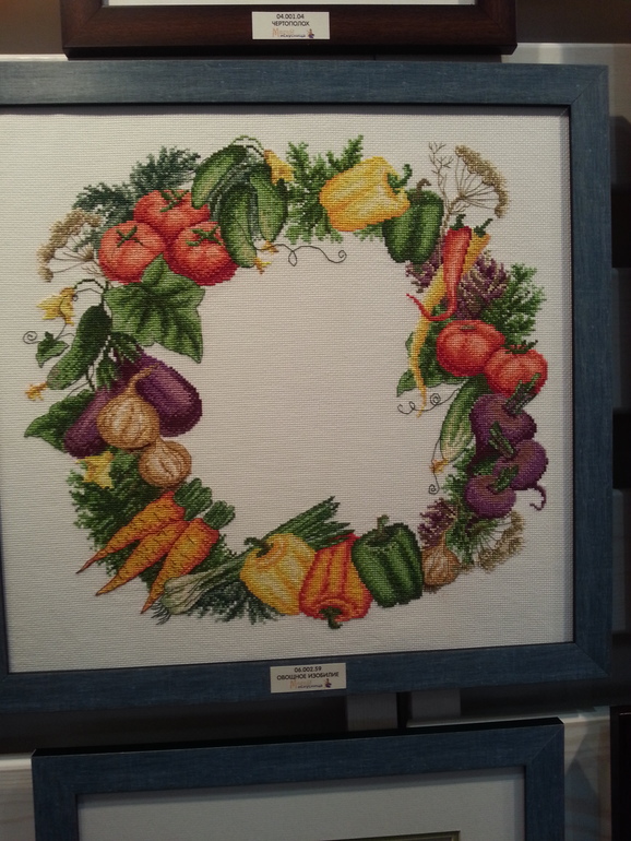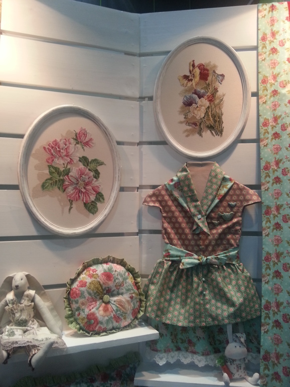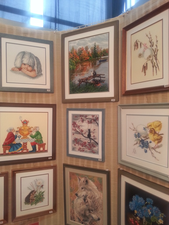 Расположение производителей на выставке то же, что было осенью, поэтому ориентироваться было довольно просто. На входе справа РТО. На этот раз они сделали упор на ткани, новинок я не увидела, но немного поглазела. Оформлено было вот таким образом, вышитых картин очень мало, но ткани классные.