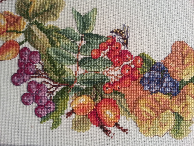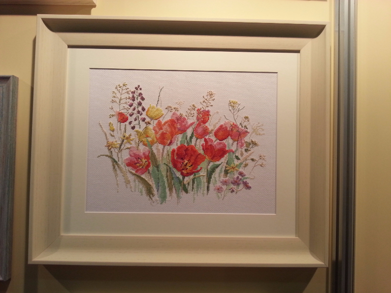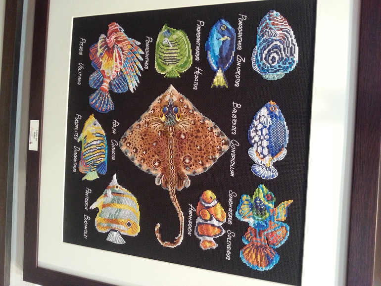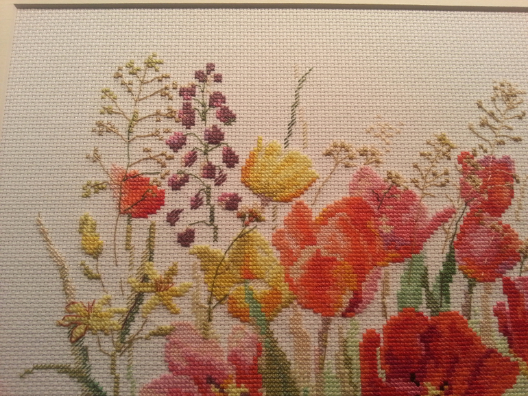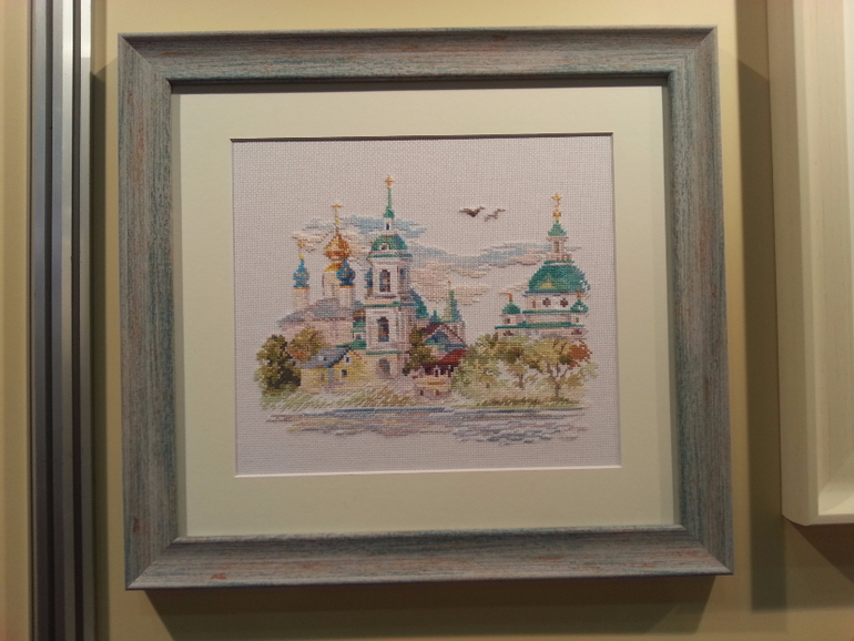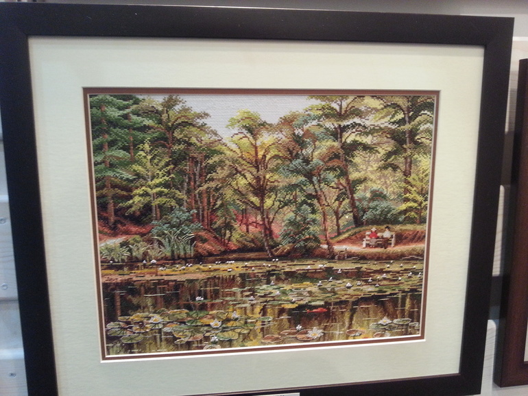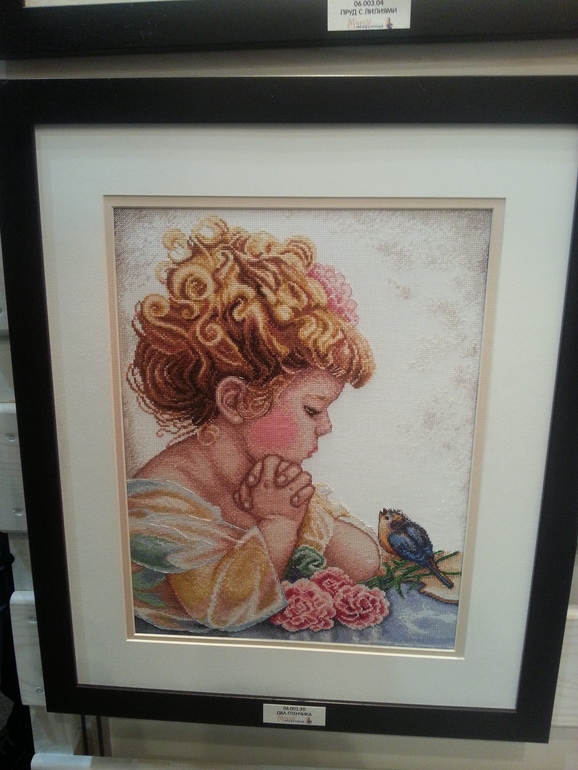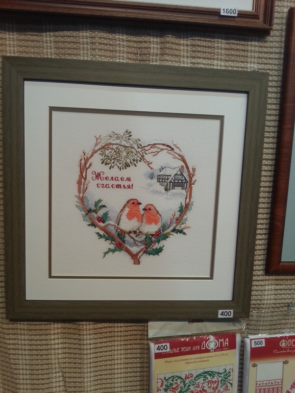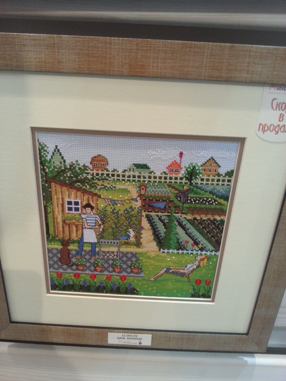Расположение производителей на выставке то же, что было осенью, поэтому ориентироваться было довольно просто. На входе справа РТО. На этот раз они сделали упор на ткани, новинок я не увидела, но немного поглазела. Оформлено было вот таким образом, вышитых картин очень мало, но ткани классные.