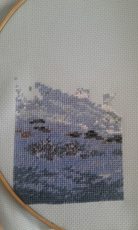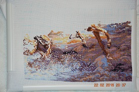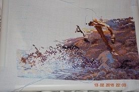 Всем привет! Времени как всегда было мало, но повышивать удалось. Доделала очень неприятный фрагмент - это брызги воды. Оставшиеся незашитые крестики - это будет бисер... Купила нитки для метрики, надеюсь, на этой недели начну и ее вышивать..
