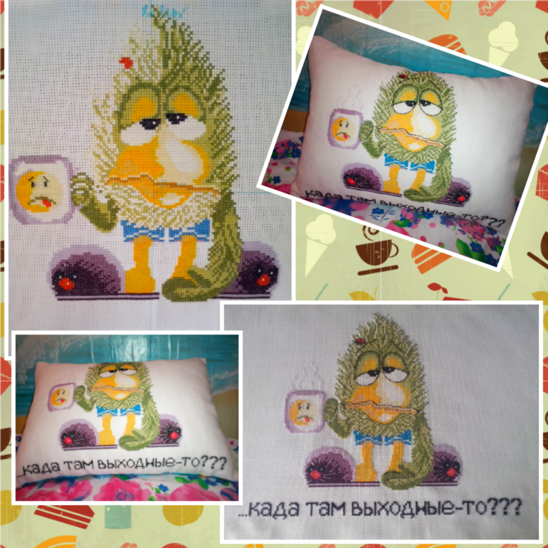 , Зелепуку я закончила, и оформила в подушечку, которая получилась приличная, детки мои по очереди ее тестировали