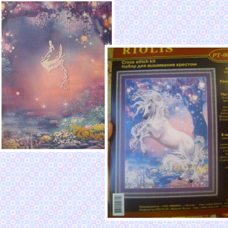 поняла , что мне еще учиться и учиться шить подушки, начала новый набор "Единорог" от Риолис, цвета ниток просто волшебные, то что успела вышить за два дня
