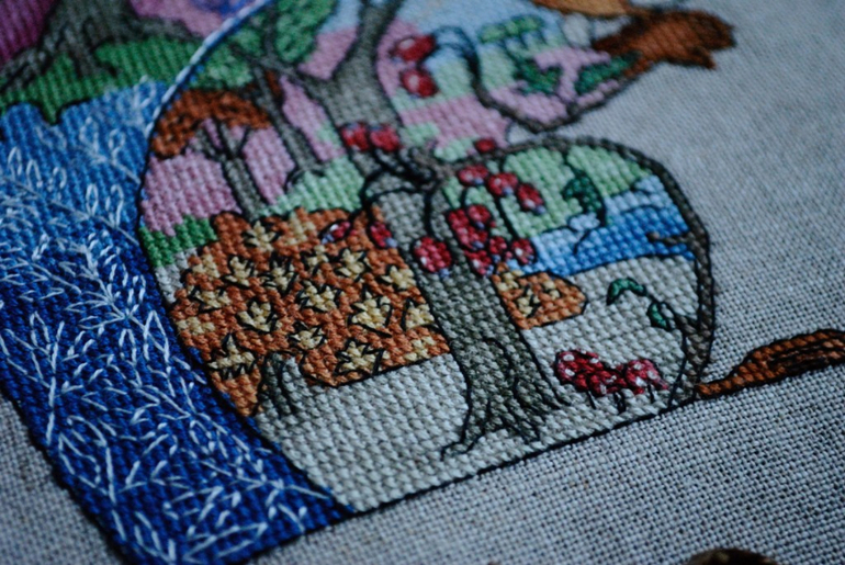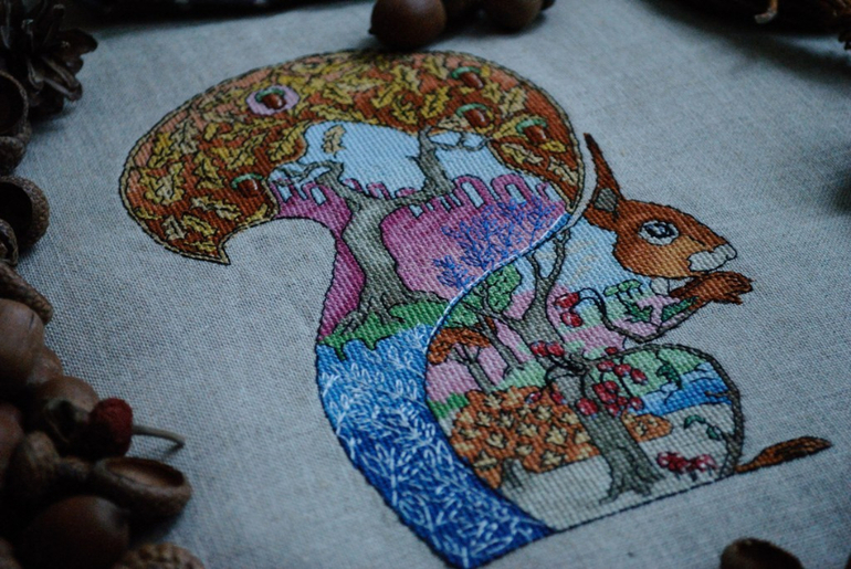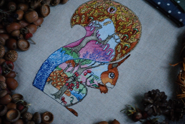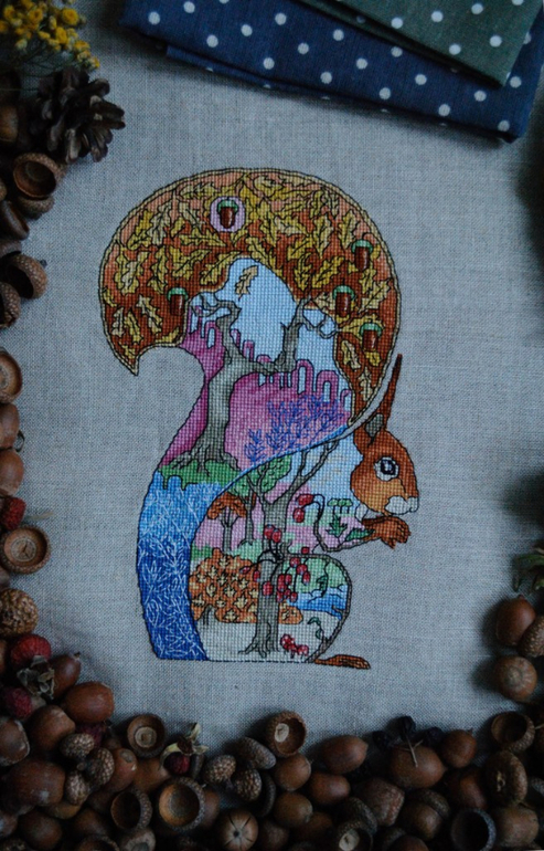Белочка вышилась за 20 дней, совершенно осенняя. И хоть вышивала ее в феврале, она преисполнена воспоминаниями о чудесной осени 2015 года и сбором всех желудей, каштанов, шишек и шиповника, которые я любовно использую в своих фотографиях :)