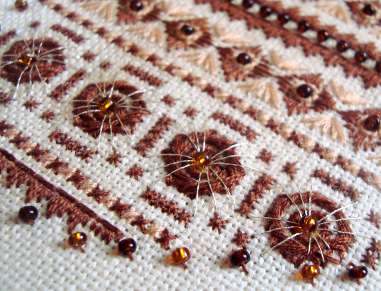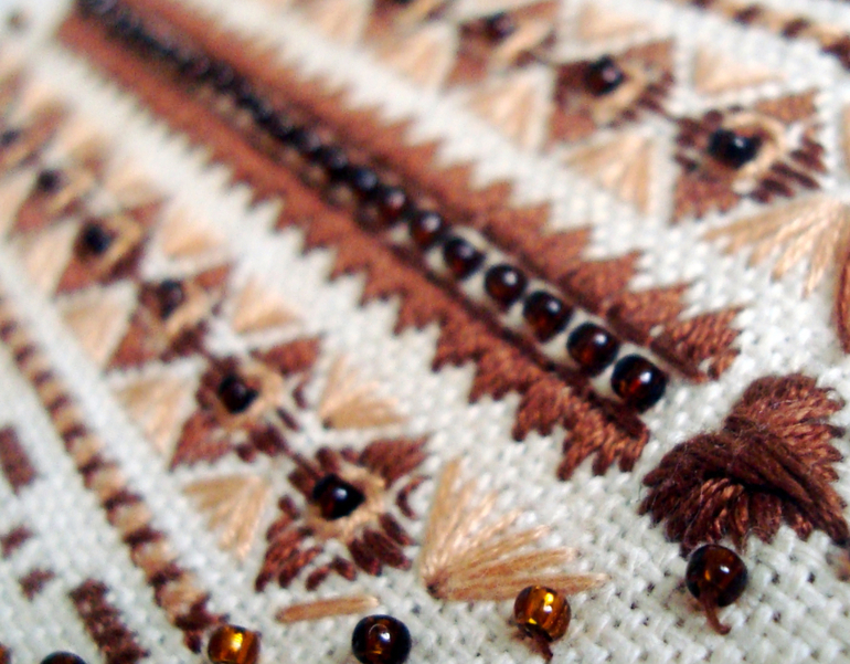 Вот таким шоколадно-кофейным оно получилось. Использовано 2 цвета мулине, 2 цвета бисера, 1 металлик и канва Линда, окрашенная вручную. Оформлено в подвеску-пинкип. Ну и фото, по традиции)))