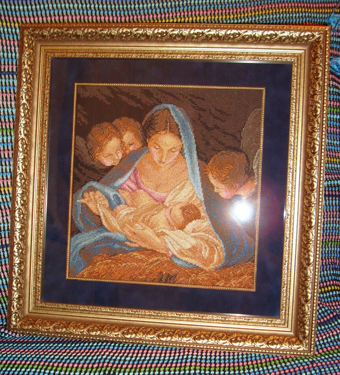 Оформила уже месяц как, сфотографировать собралась только сегодня и то не получается. Стекло простое,и все в нем отражается, фото со вспышкой очень засвеченное получилось. Паспарту темно-синее бархатное, в реальности смотрится как черное, и вся картина более приглушенных оттенков, даже щеки из-за которых я переживала не бросаются в глаза.
