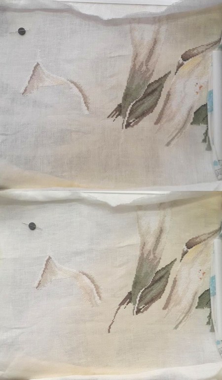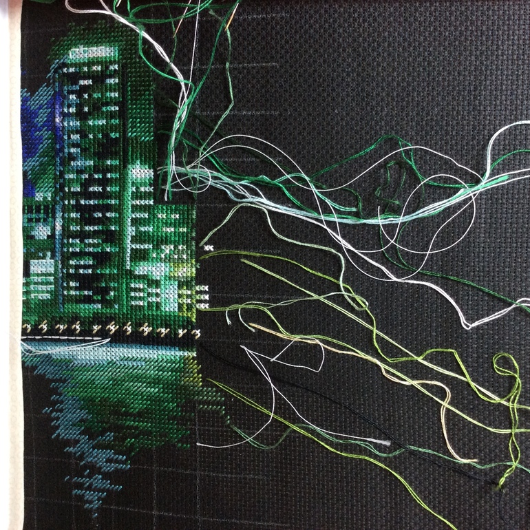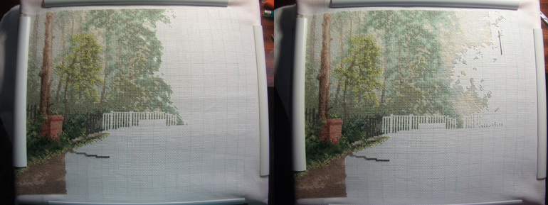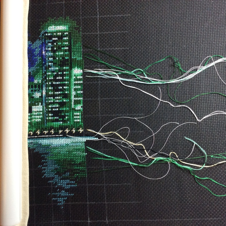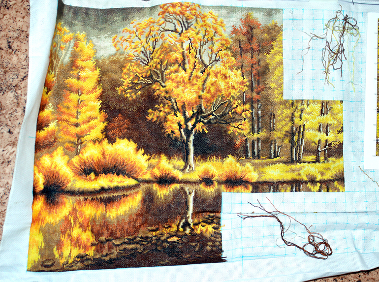 Ох потрудилась я сегодня - 2673 полукрестика. Вышила полностью небо. Остались крестики на деревьях слева. Итог 1390 крестиков.
