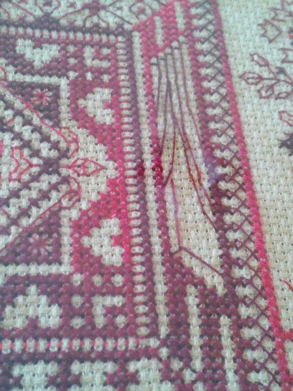 Вышит на канве с разводами, нитками DMC, поскольку у них более плавный переход окрашивания, чем у Гаммы, очень хотелось избежать того эффекта что видно при вышивке по оригинальному набору, кажется получилось, хотя порой приходилось подбирать нитки.. На 14-ю канву понадобилось три моточка почти без остатка ( 24 метра )