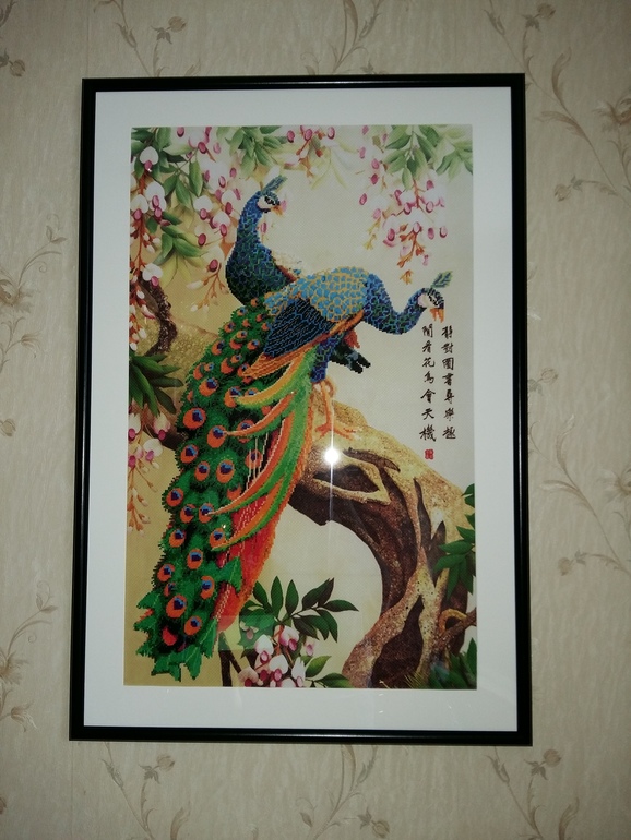 Наконец-то оформила павлинов. В июле 2014 заказала набор из Китая. Полгода вышивала и ещё полгода бедолаги ждали рамку.Не обошлось и без курьёзов. В процессе стирки неожиданно выяснилось, что цветная схема с канвы смывается! Меня чуть инфаркт не шарахнул, когда я в тазике сине-черную воду увидела! Слава богу все обошлось! Теперь моя пернатая парочка радует меня )))