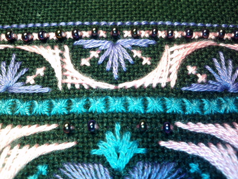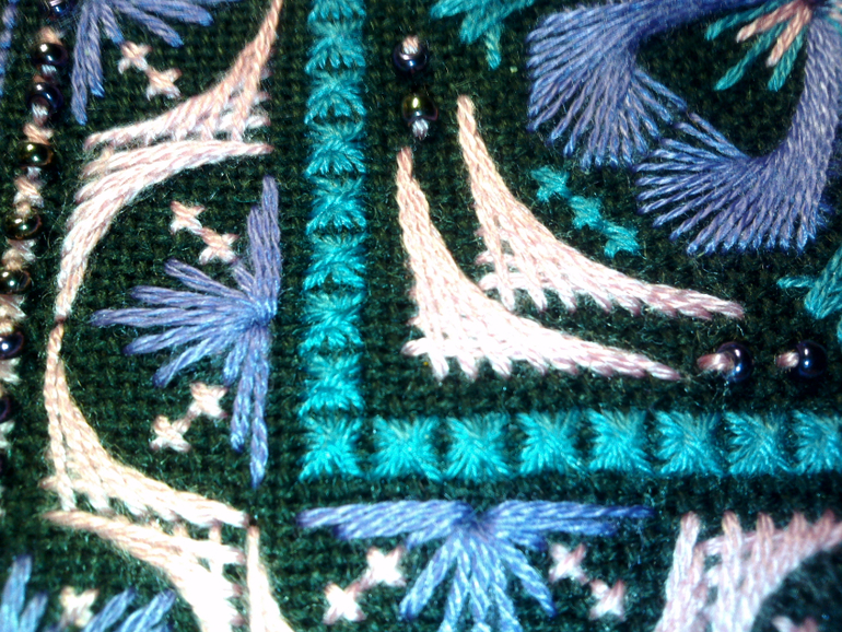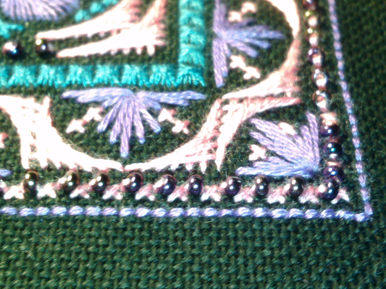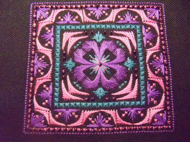 На самом деле цвет ярко-сиреневый и ярко-розовый.Только зелёный примерно как и на вышивке.