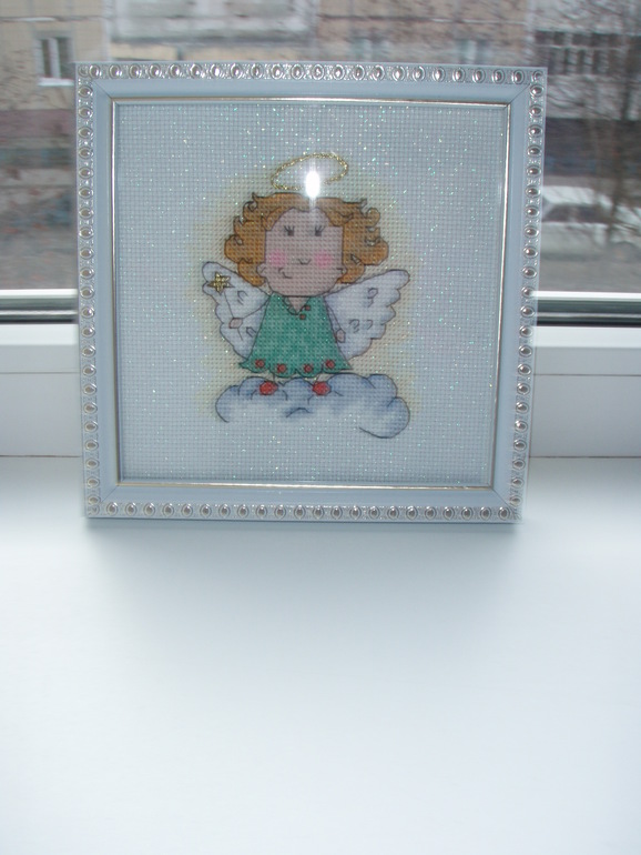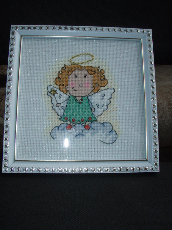 Вышила во время февральского больничного (хотелось позитивчика в то непозитивное время). Вышивался для младшего племянника в честь крестин. Успела вышить, сдала в багетку - там тоже всё срасталось по срокам, пришла забирать вся такая радостная - ты-дыщ! - закатали в багет с браком... поцарапанный (реально не заметили? или решили, что и так сойдёт?). Отдала переделывать.... расстроилась. Обещали очень быстро сделать, но до крестин всё равно не успевали уже. Прошла неделя... Стала я ангела разыскивать.... уффф.... ну в конечном итоге разыскала, так что сказ не о том.