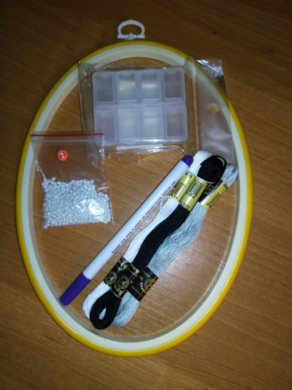 Органайзер для бисера/стразиков на 8 ячеек, ниточки мулине ПНК им. Кирова, маркер для канвы, бисер белого цвета и пяльца-рамка + вкусненькое