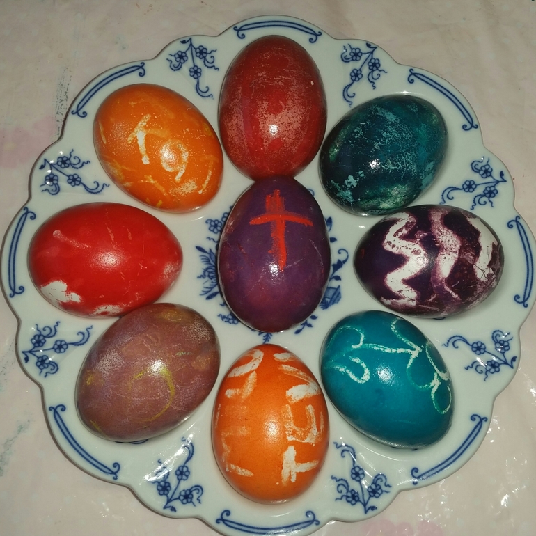 Привет! У нас в Латвии на этой недельке было 4 выходных в честь католической пасхи! Первый раз сама красила яйца, приобщив к этому девчонок. Они 2 яйца покрасили и при этом же сразу их разбив :)))) но это неглавное! Главное - процесс и красота! :) Мы по-моему их есть не будем :) Они так и стоят на столе в качестве декора. :) Последние 2 дня - настоящая весна! Класс. Долгожданная! Но завтра опять дождь по прогнозу :( В вышивке дорисовалась веточка. И уже покрутила канву наверх. Поэтому мой Жоржик - теперь всадник без головы :))) но это временное неудобство! :) Вообще когда вышитое подкрутила, сразу натяжка хуже стала. Я б сказала, совсем она пропала. Пришлось по бокам донатягивать. Но все равно не идеал! :( Вот результат вышивки, наши яйца и первая весенняя ящерка! :)