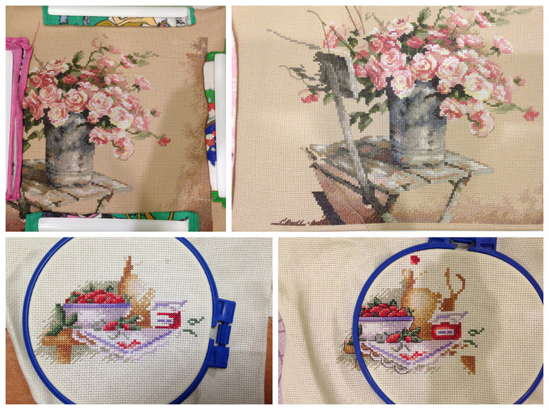 Всем привет)) Буду не оригинальна с больным горлом, вроде сначала не сильно, но сегодня дерет сил нет((( Вот что значит весна обманчива, где-то надуло... Новостей особо никаких, суета-сует... Обе вышивки подрастают потихоньку, у Роз поменяла снапы, думала что стул у меня вышит больше, в итоге еще вышивать и вышивать... Шила ножку и спинку. Зато Клубнички идут как песня, с удовольствием их вышиваю. Вот и результаты: