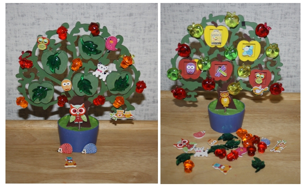 На дереве,фруктах, зверушках и птичках магнитики. Малыш прикрепляет и снимает их с дерева. Должен попадать именно в то место где магнитик