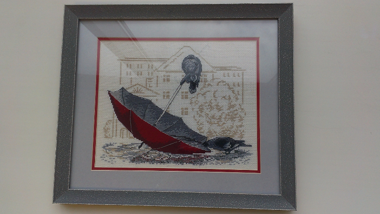 Вышивка крестомДевочки, всем привет! Спешу поделиться - достала из тумбочки, отгладила свой зонт, и решила оформить. Первый раз в багетке оформляла, замучила я там всех по моему. Зато теперь к моей столешнице подходит идеально рама) Хотя девушка-приемщица и сказала что подбирать оформление к интерьеру это дурной тон!