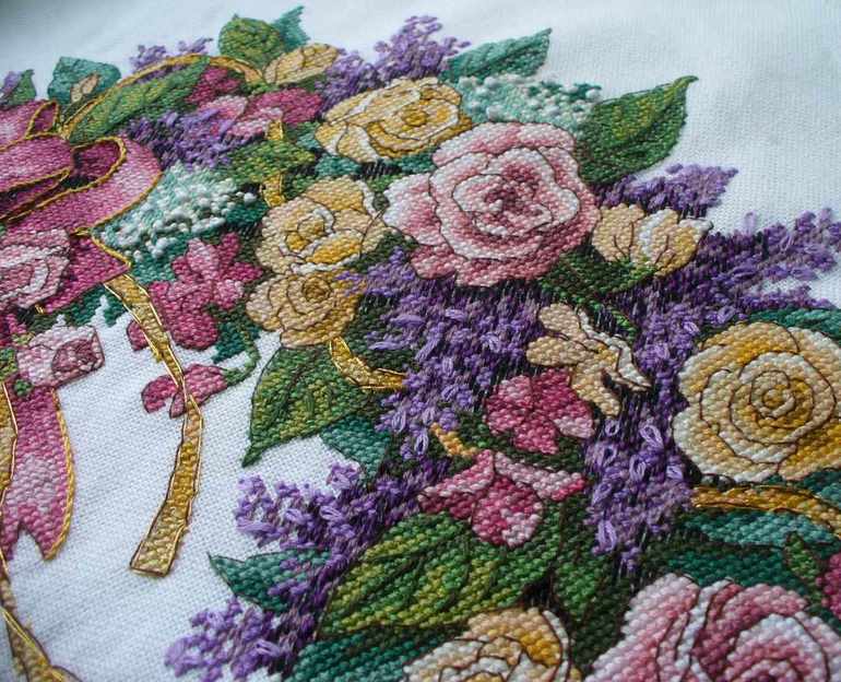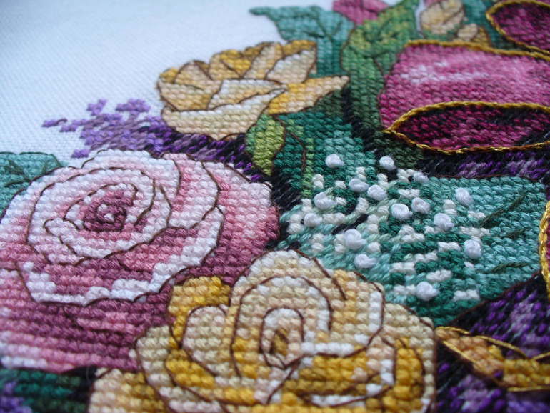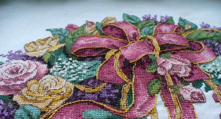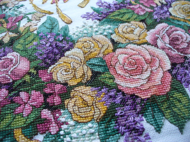 Вышивка крестомДевочки, привет! Наконец я закончила свою работу "Венок из роз"от Dimensions. Вышивала ее по китайскому аналогу на равномерке 28 каунта нитками ДМС и Анкор. Размер 41х41. В работе используются крестики и полукрестики в три нити, фр. узелки в шесть! нитей, бэк, кординг, на удивление лёгкий и выкладная нить.
