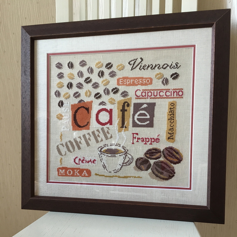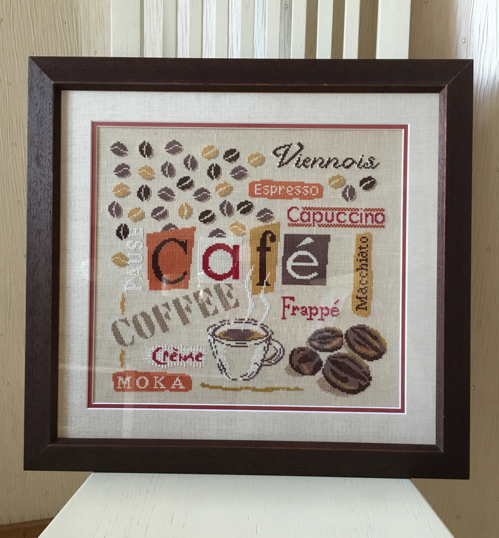 ждало , пока моя подруга вдруг мне скажет : - Мне на кухню на стену нужно что-то красивое в кофейном стиле )))) Показываю вышивку и ДА ! ХОЧУ ! Оформляй в картину , я у тебя ее покупаю )))))) Понеслась в новую мастерскую , получила массу удовольствия от нового места, от девочек которые там работают , от ассортимента )))