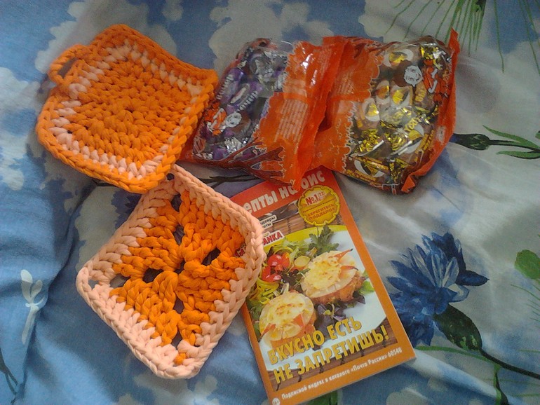 Конфетки из Перьми :-) книжка с рецептами и подставка и прихватка из пряжи Спагетти :-) как раз подходит под дизайн новой кухни :-)