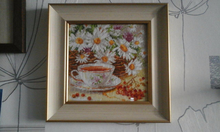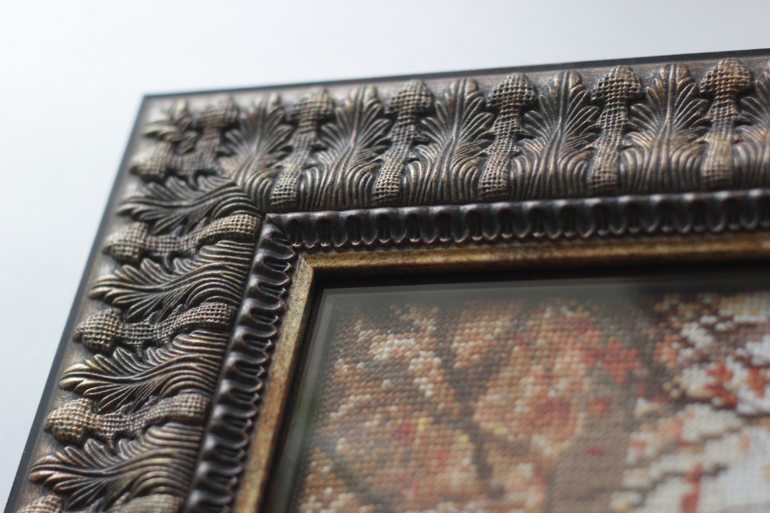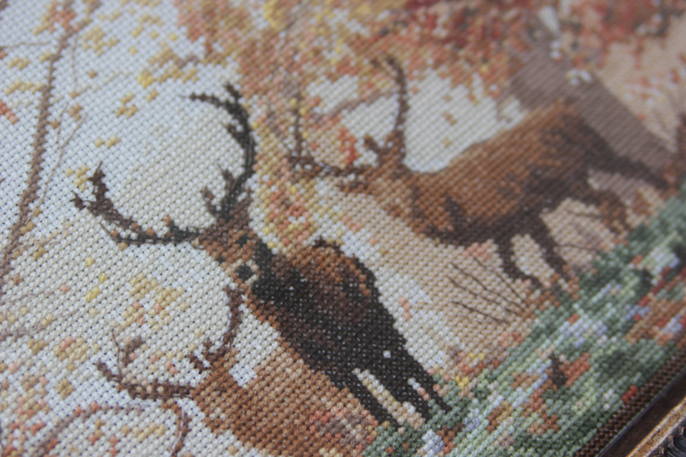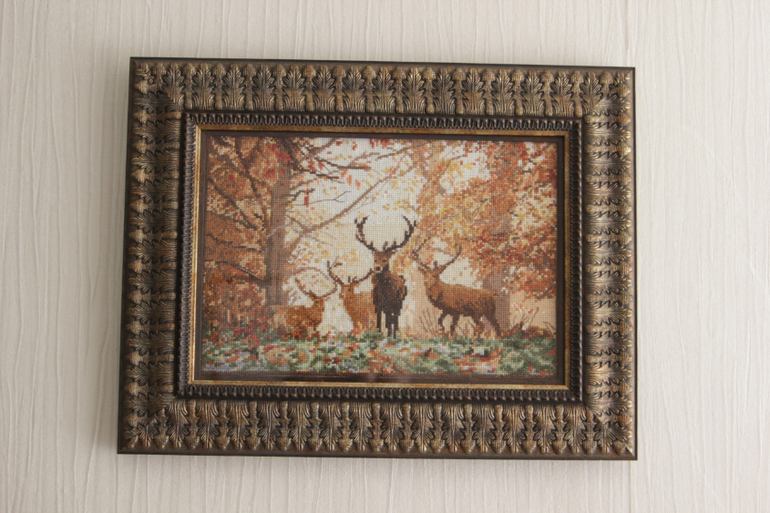 Олени в лесу. Довышиты 4 ряда и оформлены без особого напряга. Обожаю этот багет, под дубовые листья. Даром что пластик, выглядит благородно!