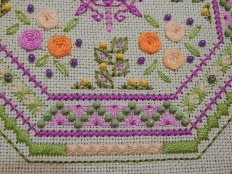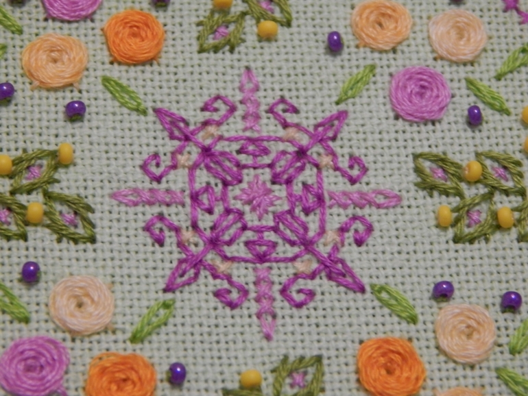 Долго мучалась с выбором цвета для розочек. Вышила для сравнения разными нитками да так и оставила)
