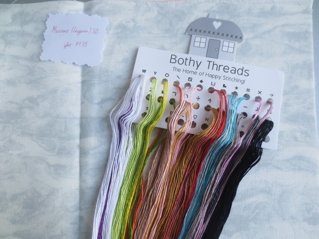 В набор входит нежно-голубая канва, схема на листах А3 (что мне кажется не очень удобно для работы), нитки Мадейра, игла..