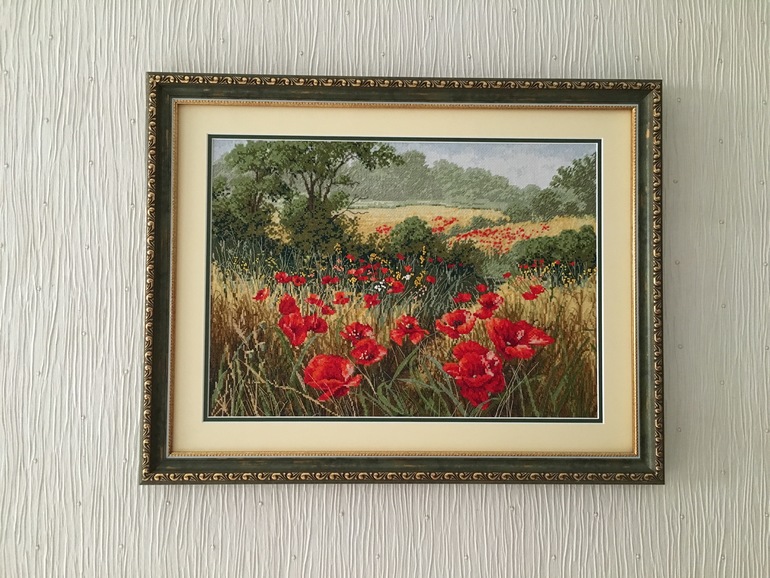 Вышивала ,это всем знакомое Анкоровское поле, в 2010 году . Пообещала маме оформить и подарить еще 2 года назад ))))))) Ну все звезды совпали и все получилось ))))) Дождалась мамочка ! Картина большая , со всеми прелестями для нас вышивальщиц )))) и полукрест, и бэк, и фрузелки :