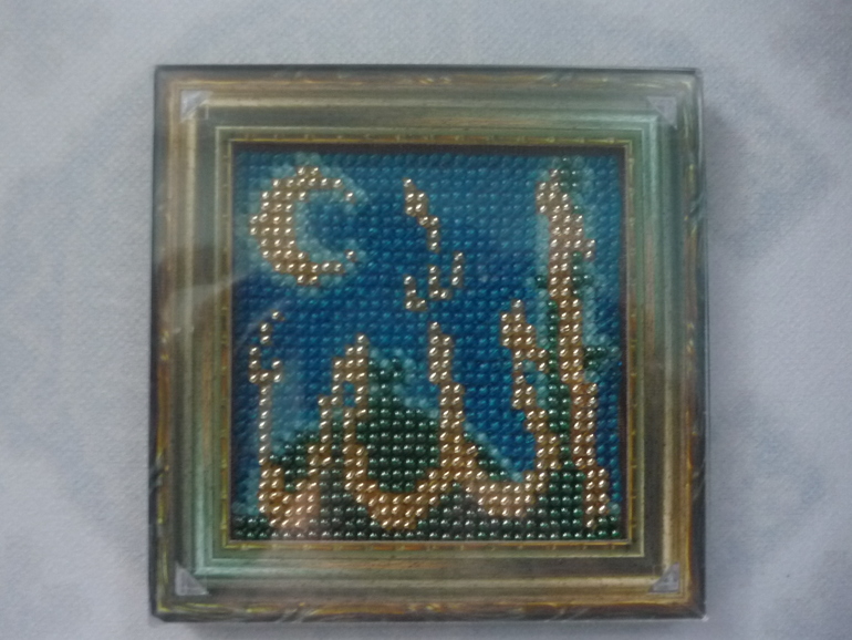 Вышивка бисеромЗаказали мне что-нибудь по теме Ислама- маленькое,чтобы можно было с собой носить или в машину приклеить,,,,вот что я нашла и вышила за один день . Набор фирмы "Вышивальная мозаика" 6,5х6,5см (в рамке 9х9 см), Ткань (хлопко-льняная) с нанесенным рисунком-схемой . Цветная бумажная схема . Чешский бисер . Подробная инструкция . В состав набора входит бисерная игла, акриловая прозрачная рамка с подставкой, подвесом и бумажной рамкой-паспарту, магниты, двухсторонняя клеевая лента. Всё в наборе понравилось,бисера ещё осталось на одну работу.