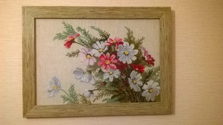 Но тут мне опять "повезло" ) Нашла рамку, которая понравилась в новой для меня багетке. Профессионалами там и не пахнет. Я им дала размер рамки, а они мне по 1,5см обрубали со всех сторон (типа это я должна была предвидеть, что там еще загин, и это мне нужно было давать размер с запасом) 1-2 ряда крестиков спрятали под рамку, ну и натяжка тоже очень и очень кривая. Я не приняла такую работу, тем более на багет ждала почти две недели. Пообещали перетянуть. Короче перетянули тоже криво, только уже не три ряда, а два кривых. Доказывают, что это я доколупалась, что это ткань, и ее нереально идеально натянуть. Ну что, теперь буду десятой дорогой их обходить. Ну и фото скромное с телефона, т.к. уже висит мой подарок в мамы дома.