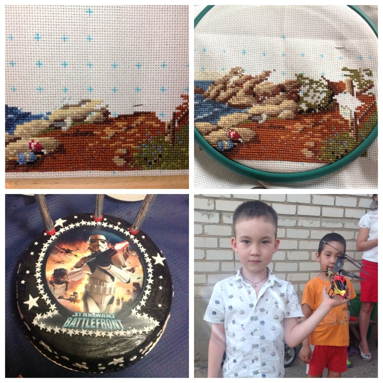 На прошедшей неделе праздновали день варенья моего старшего сыночка. Подарили парню вертолёт на пульте, радости нет предела. Ну и мои было-стало, торт (испечённый снова моими ручками) и именинник с подарком.