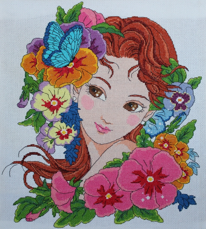 Набор называется "Лаура". Молодой, Красноярской фирмы "LADYMAESTRA". Заметила и купила я его на одной из выставок - "Формулы рукоделия". Чем-то девушка на вышивке, мне неуловимо напомнила дочку.