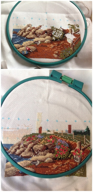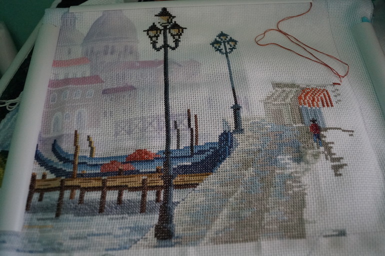 Всем привет! У нас опять стоит жара, в тени +38-40,просто не выносимо. Спасает ,что работаю дома и никуда в такую жарищу не хожу.Эх скорее бы осень)Крестики все закончила,осталось оживить всё беком...и приступать к следующему сюжету.Ой,только на фото заметила одно окошко чёрным не вышила)