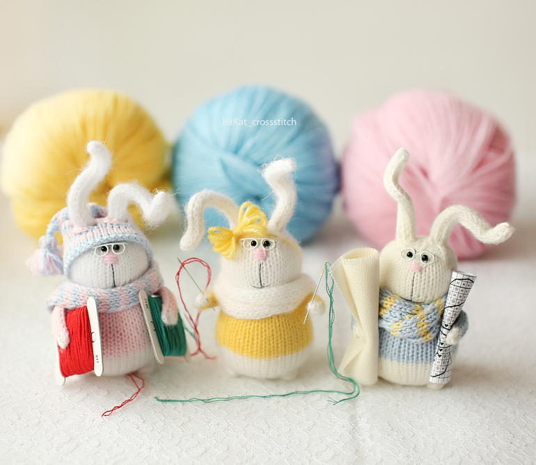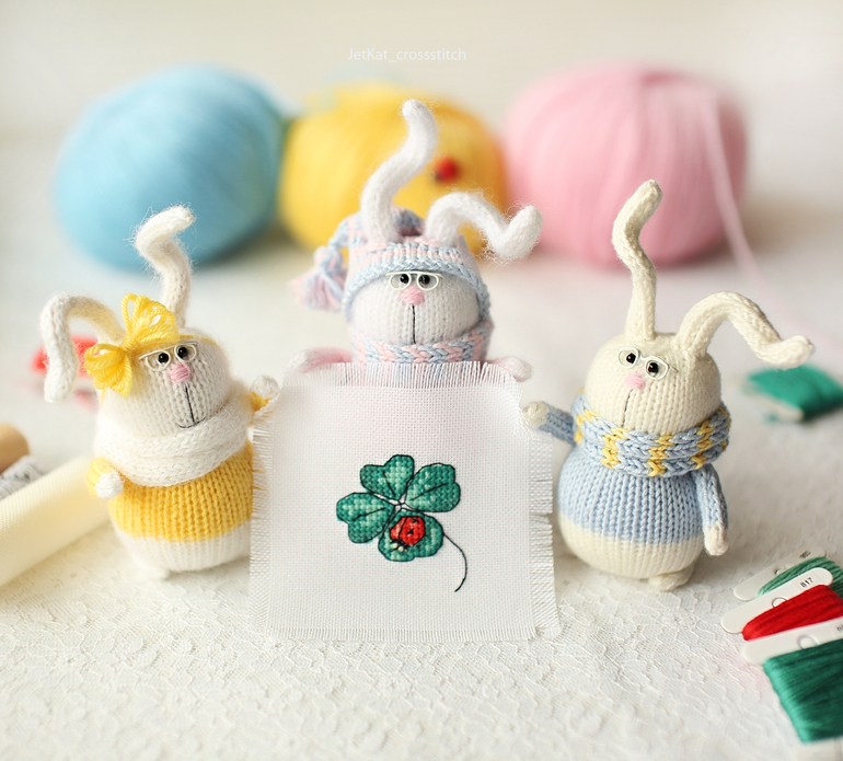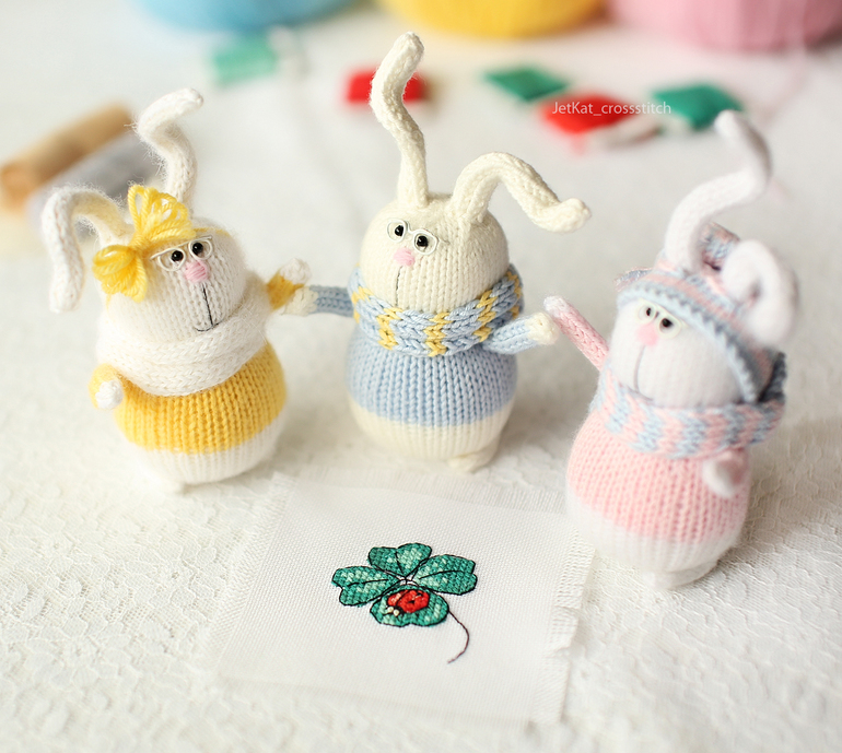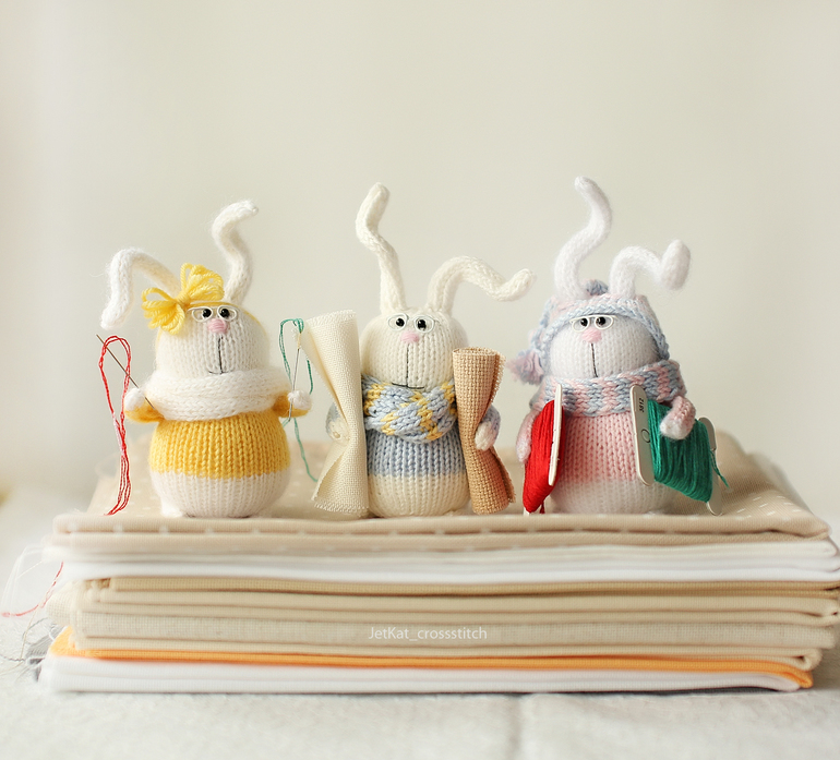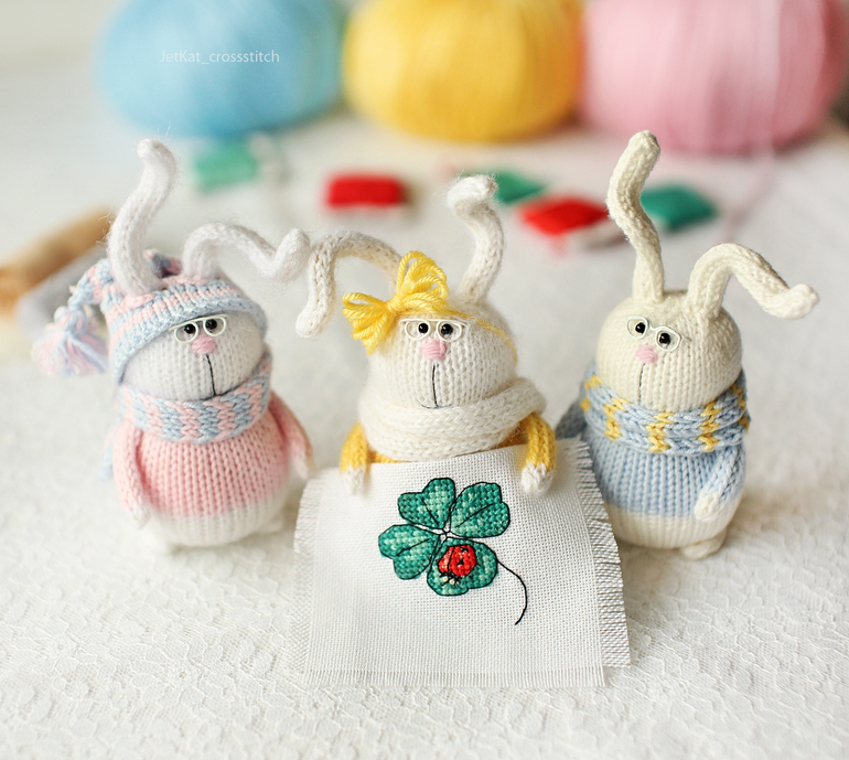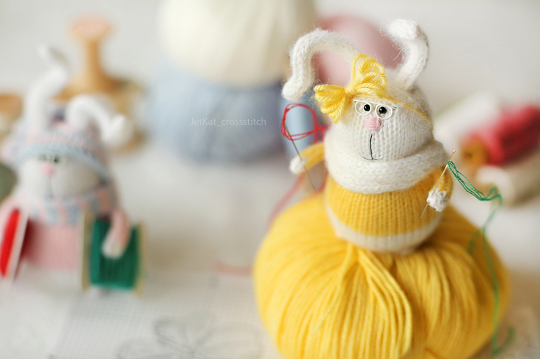 Устали все, поэтому после такого насыщенного дня зайцы расплющились на клубках, лежали и обсуждали свой общий вклад в их первую вышивку :)