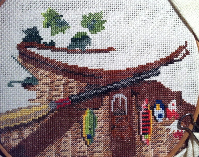 Вышивка моя растёт и меня радует)) За неделю появились справа рамка, открытка и маленькая ракушка.