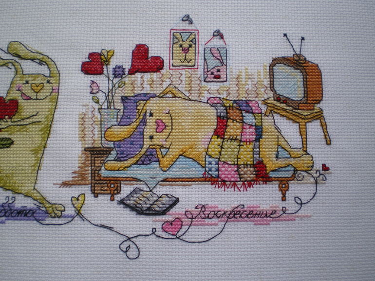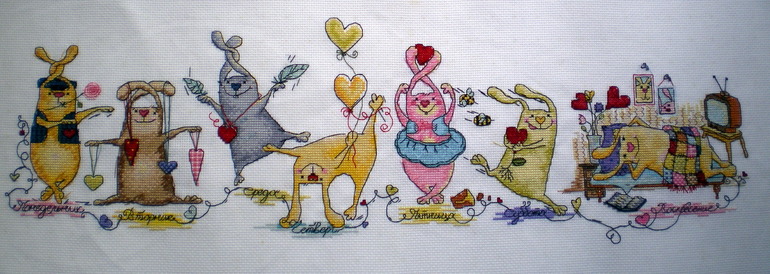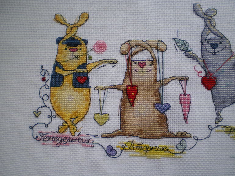 !!! Она прислала мне отшитый набор. И я неспешно принялась за работу. Сказать, что я влюблена в этих зайцев - ничего не сказать! Работа шла в качестве отдыхалочки, но основное как-то поблекло в сравнении с ними )))) Ну и фото