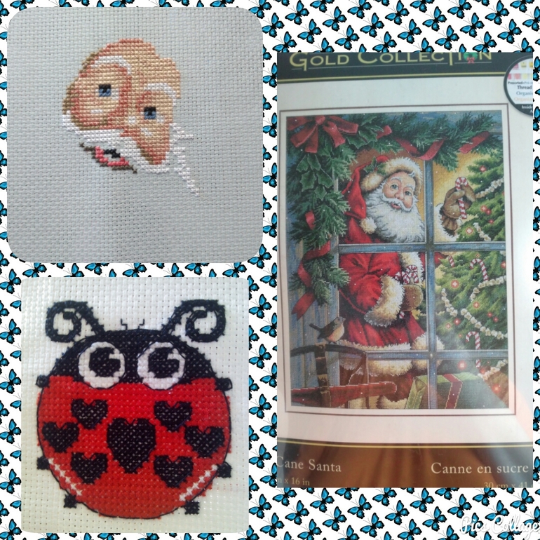 и пока я раздумывала, что буду вышивать следующее за мишками, появилась у меня божья коровка по авторской бесплатной схеме Tatami, и отдохнув немного, приступила к новогоднему Диму, это Санта с леденцами или как еще называют Санта с сахарными тросточками, очень нравится сюжет, шьется легко, ну это я еще недошла до полукреста в 6 нитей
