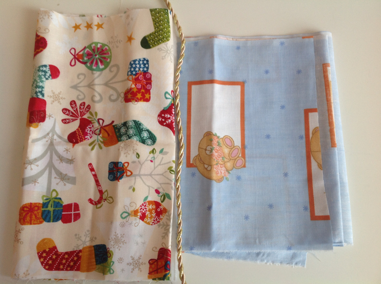 Подкладку взяла , какая была, по цвету никак, зато тоже с мишками. Заднюю сторону сделала из ткани для пэчворка с рисунком Сапожок. Окантовку из блестящего шнура, чтоб нарядно было.