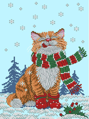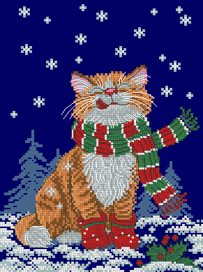Если ночь, то как вариант можно еще месяц на небо добавить, "поиграть" со снегом под котенком и т.д., ёлки вышить полукрестом