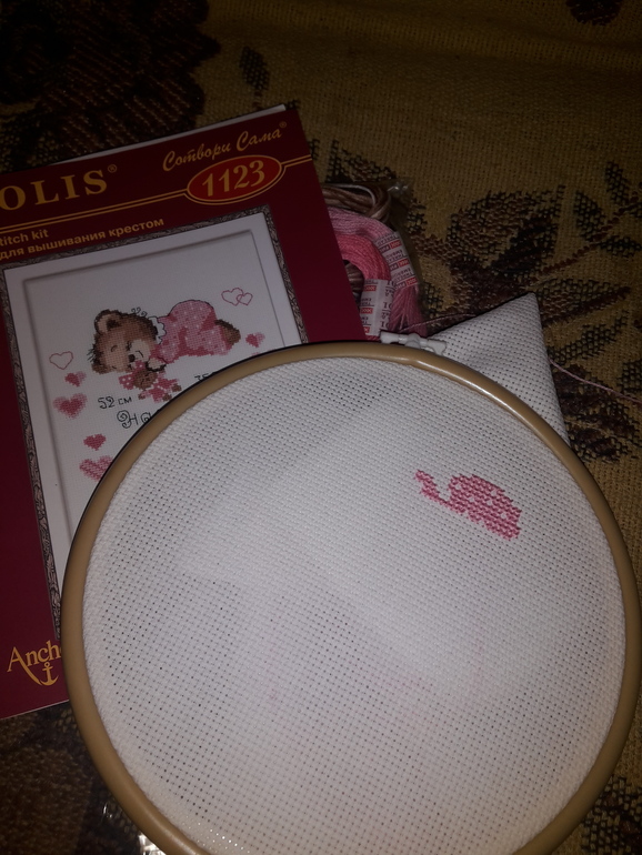 Хотела вчера бек и на личике доделать, но решила все в конце "забечить"... хочу на этой недельке мишку вышить, надеюсь вышью... очень нравится вышивать эту метрику, просто отдыхаю с каждым крестиком.