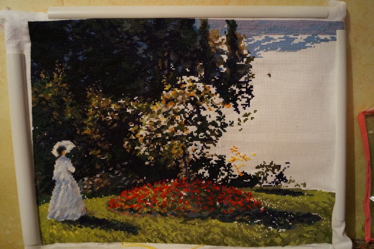 Девочки все огромный привет! Как вы заметили я закончила Венецию, чему я безумно рада. Теперь надо закончить еще одну работу это "Дама в саду" от Риолиса, начинала ее в прошлом ВД. Вышивала что мало на неделе, поэтому результат маленький.