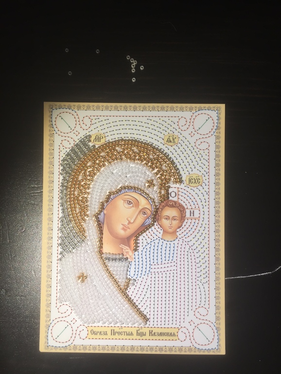 Потом я поняла, что надо начинать вышивать маме подарок ко дню рожденья, иначе опять же опоздаю. Купила складень от Ново Слободы "Богоматерь Казанская". Очень красивый набор, вышивать одно удовольствие.